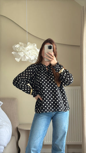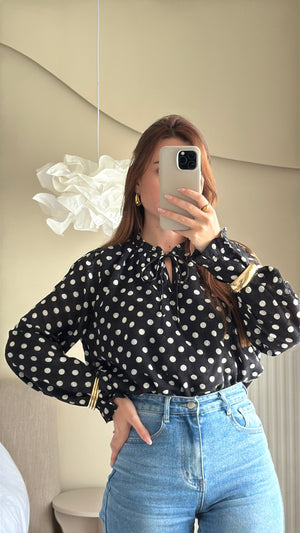 Cette blouse noire à pois blancs allie élégance et modernité. Son col haut sophistiqué contraste avec son décolleté subtil pour un rendu chic et raffiné, idéal au bureau comme en soirée.