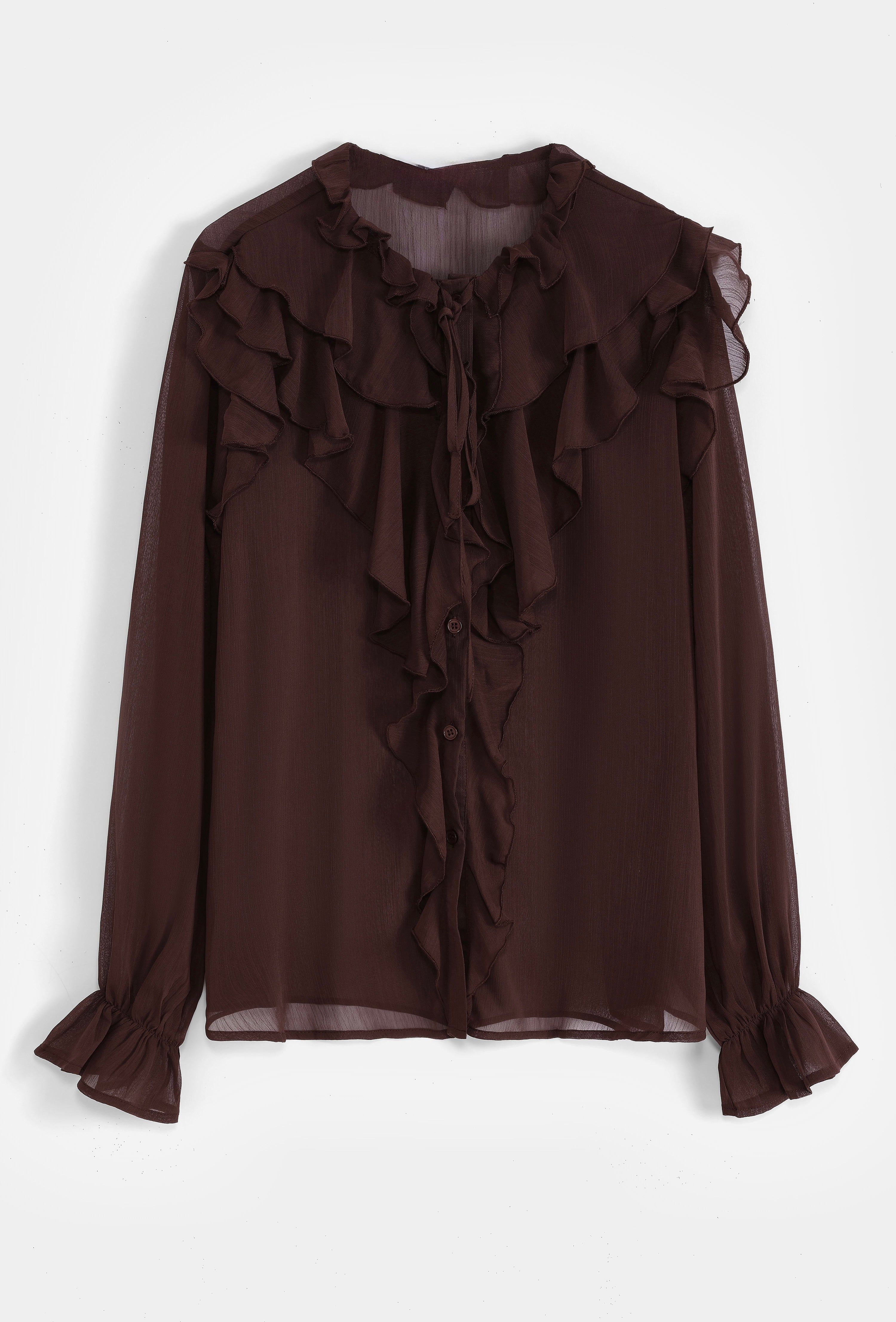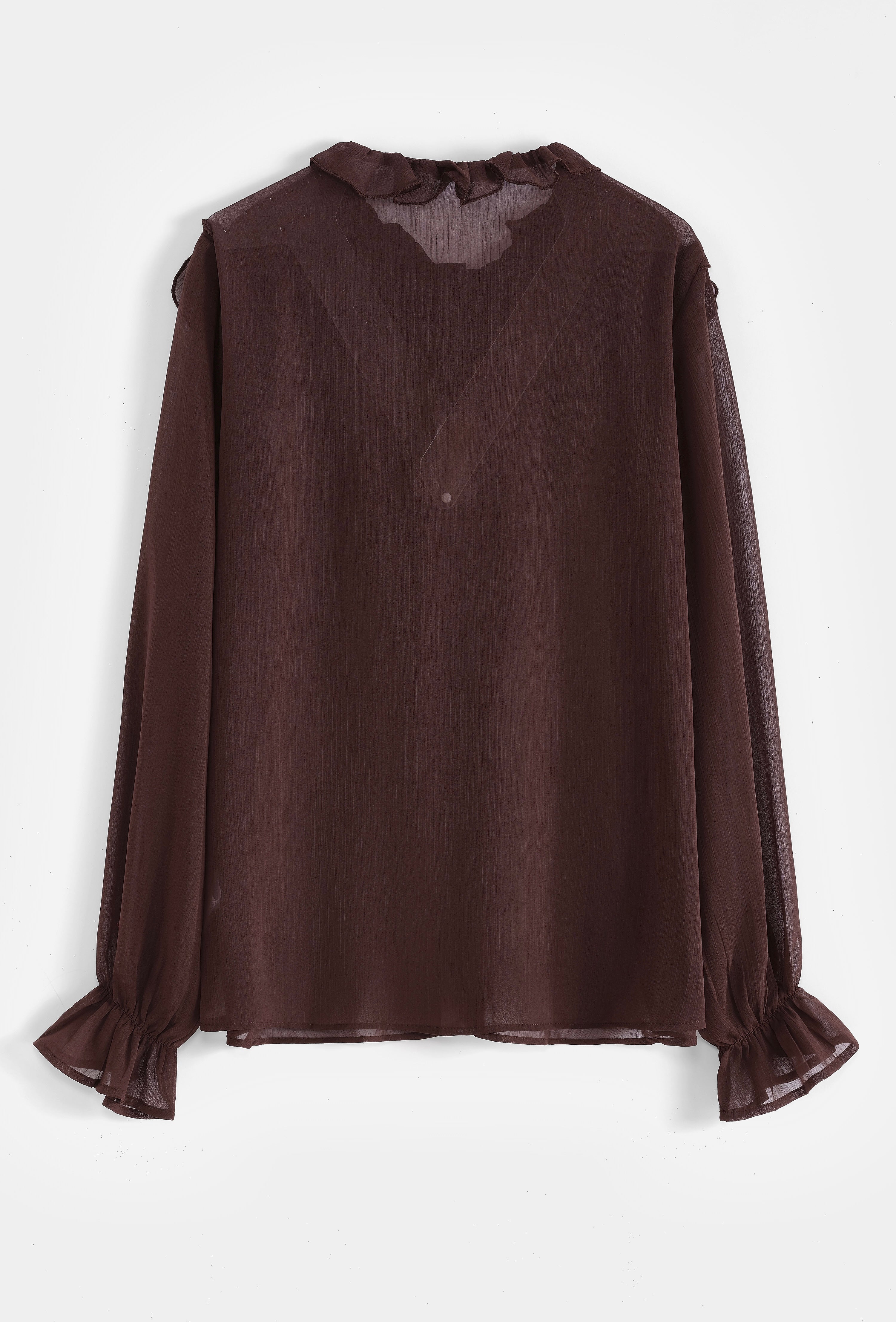 Cette blouse chocolat foncé en voile léger séduit par son jeu de volants raffinés et son allure féminine. Fluide et délicate, elle apporte une touche sophistiquée à toutes vos tenues.