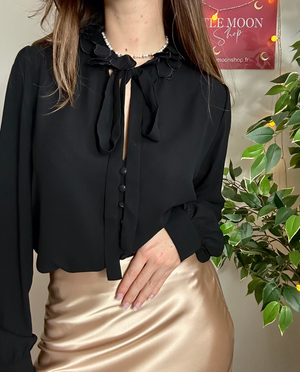 Au centre de son design, un col rond délicatement orné de tissus floraux attire immédiatement l'attention. Les fleurs brodées sur le col ajoutent une touche de fraîcheur et de romantisme à la blouse, créant un contraste subtil mais saisissant avec le noir profond du tissu. Ce détail délicat apporte une dimension artistique à la blouse, lui conférant une élégance subtile.