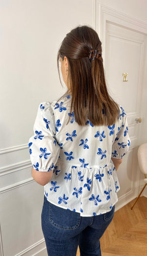 La blouse blanche à motif floral bleu incarne l'élégance et la féminité avec une touche de charme printanier. Confectionnée dans un tissu léger et doux, cette blouse offre un confort exceptionnel tout en ajoutant une touche de style à votre tenue. Les détails distinctifs comprennent une fermeture avec trois nœuds délicats sur l'avant, ainsi que des manches bouffantes qui apportent une touche de romantisme à votre look.