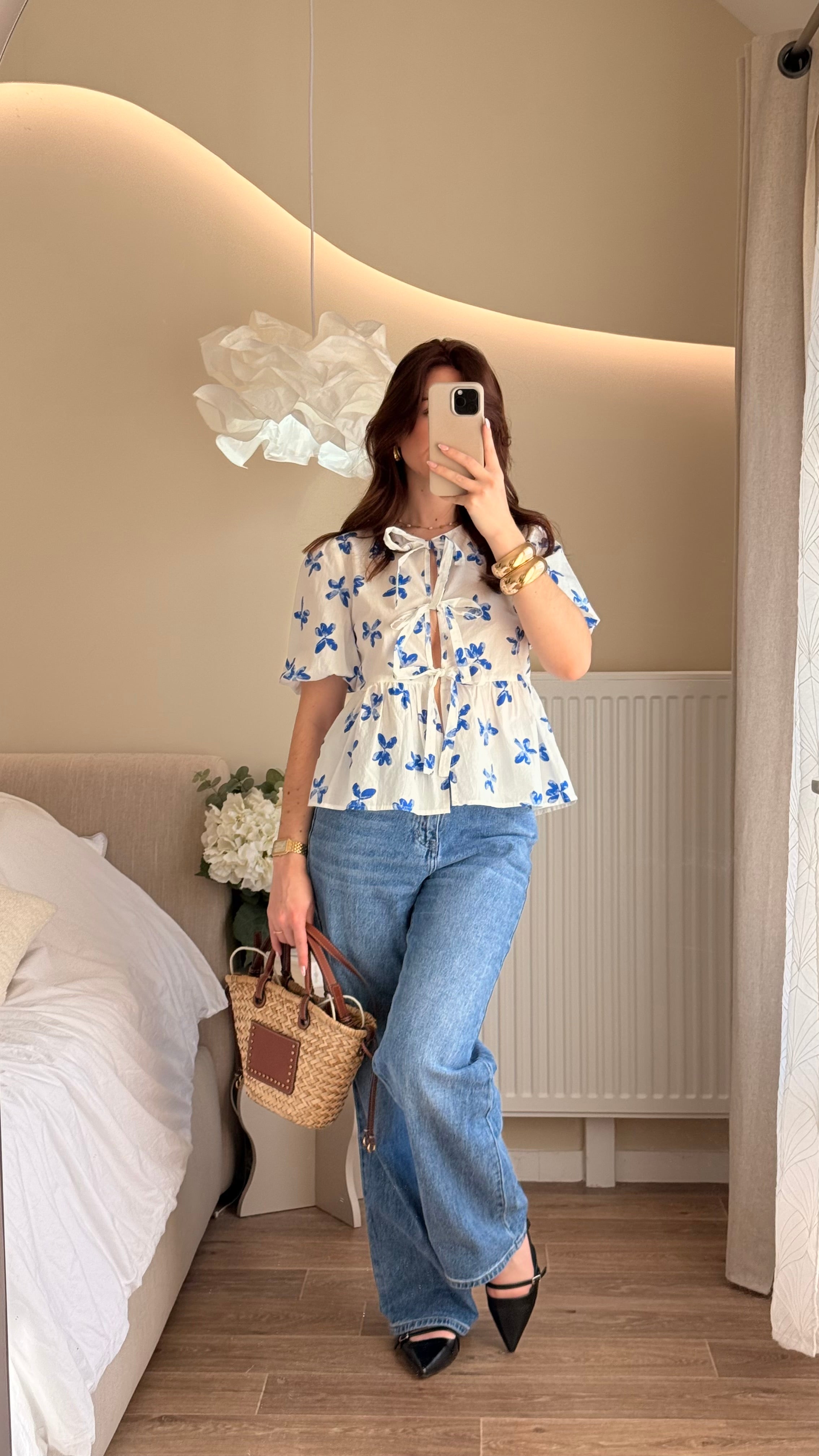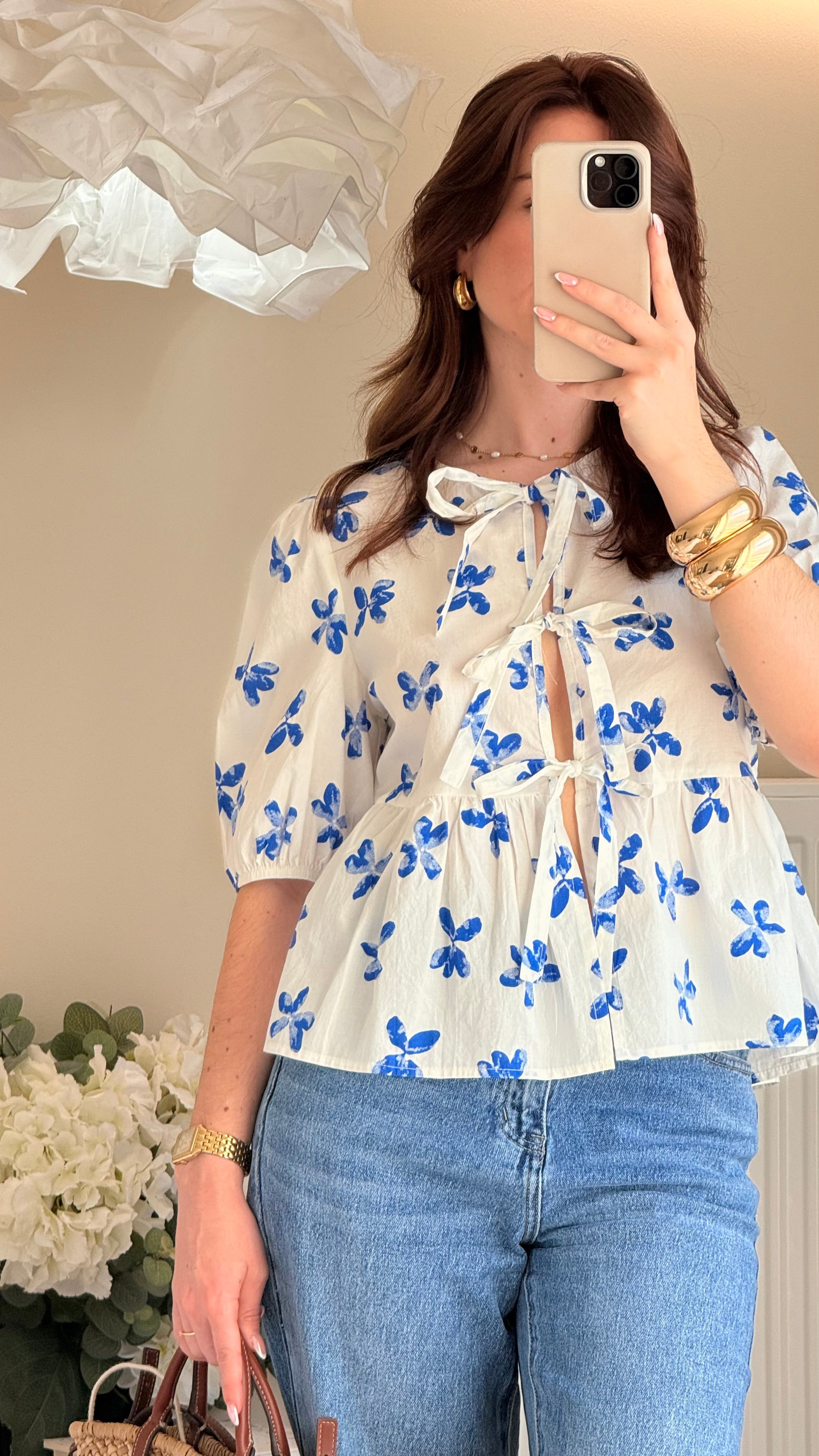 La blouse blanche à motif floral bleu incarne l'élégance et la féminité avec une touche de charme printanier. Confectionnée dans un tissu léger et doux, cette blouse offre un confort exceptionnel tout en ajoutant une touche de style à votre tenue. Les détails distinctifs comprennent une fermeture avec trois nœuds délicats sur l'avant, ainsi que des manches bouffantes qui apportent une touche de romantisme à votre look.