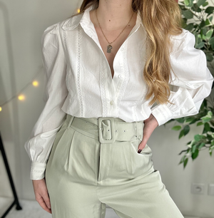 Cette blouse blanche avec manches bouffantes est parfaite pour un look professionnel ou pour une occasion formelle, mais elle peut aussi être plus décontractée selon l'association que l'on choisit.