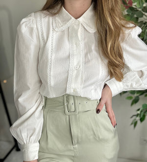 Elle est le parfait équilibre entre féminité et élégance, tout en étant confortable à porter. Cette blouse est un véritable chef-d'œuvre, avec ses manches bouffantes délicates et ses détails subtils qui en font une pièce unique et précieuse.