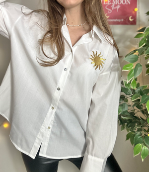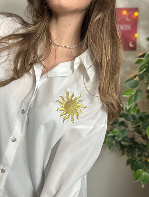 Au cœur de son design, un soleil brodé orne le devant de la chemise. Ce soleil, avec ses rayons délicatement stylisés, évoque l'énergie et la chaleur de l'été, ajoutant une touche de soleil et de bonne humeur à votre tenue. La broderie apporte également une dimension texturée et artistique à la chemise, lui conférant un charme unique et accrocheur.