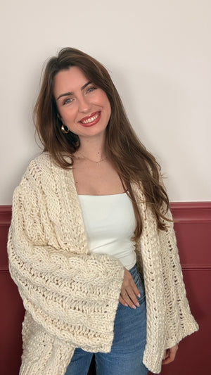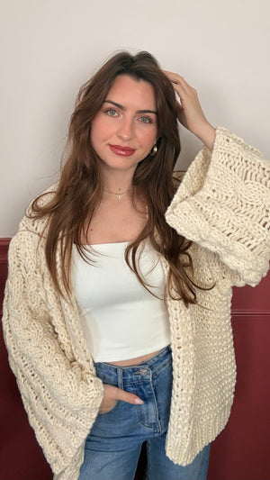 Apportez une touche bohème et chaleureuse à vos tenues avec ce gilet en maille épaisse, à la fois confortable et élégant. Sa texture travaillée et son tricot ajouré lui donnent un style artisanal et tendance, parfait pour la mi-saison comme pour les journées plus fraîches.