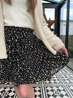 Cette jupe courte plissée est une pièce vibrante qui mélange habilement l'audace et l'élégance. Sa base noire offre une toile de fond sophistiquée, tandis que les détails de couleur crème et dorés apportent une touche de lumière et de contraste.