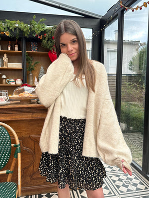 Les plis soigneusement disposés ajoutent du mouvement et de la texture à la jupe, créant un jeu de lignes et de formes qui lui confère une allure dynamique. Les détails de couleur crème et dorés, ajoutent une touche subtile d'éclat et de sophistication à l'ensemble.