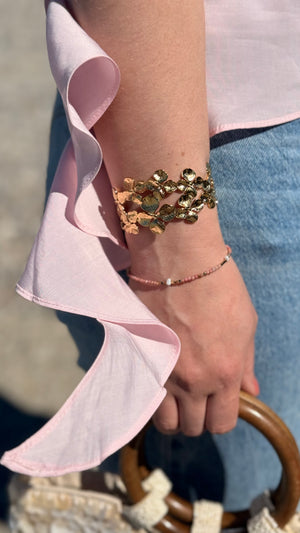 Sa structure ouverte et son fini doré éclatant en font une pièce "statement" qui habille instantanément le bras. Que ce soit pour illuminer une tenue de jour décontractée ou pour parfaire une silhouette de cérémonie, ce bracelet apporte une touche de poésie et de lumière à votre style.