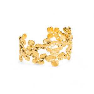 Véritable sculpture à porter au poignet, le jonc Fleur célèbre la beauté organique de la nature. Cette manchette ajourée est composée d'une constellation de fleurs stylisées aux pétales délicatement martelés pour un rendu artisanal unique.