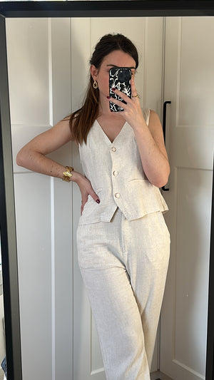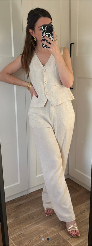 Ajoutez une touche de confort et de style à votre tenue estivale avec ce pantalon en lin avec bouton effet bois. Polyvalent et élégant, il est parfait pour toutes les occasions, des journées décontractées aux soirées estivales.
