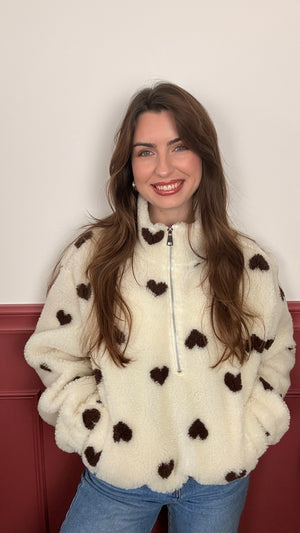 Avec son zip demi-longueur et son col montant, il apporte une touche moderne tout en restant pratique. Les petits cœurs contrastés ajoutent une note chaleureuse et tendance, facile à associer avec un jean ou un pantalon casual.