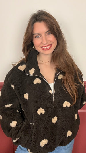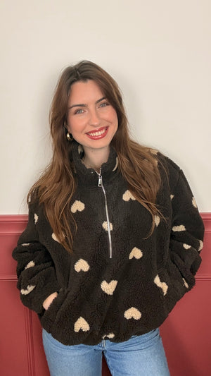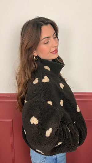 Avec son zip demi-longueur et son col montant, il apporte une touche moderne tout en restant pratique. Les petits cœurs contrastés ajoutent une note chaleureuse et tendance, facile à associer avec un jean ou un pantalon casual.