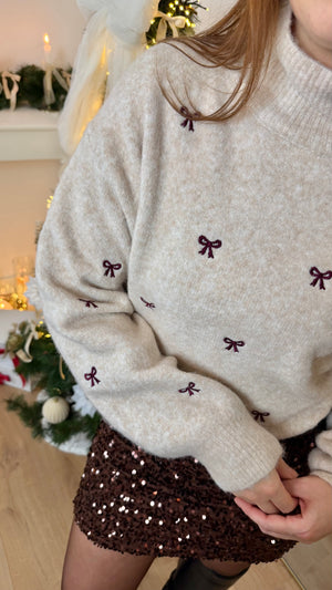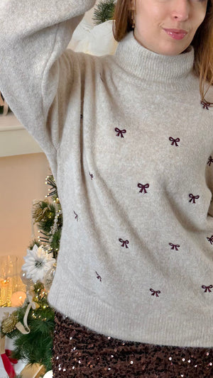 Découvrez notre nouveau pull Ophélia. Un tendre pull avec un col cheminée pour vous maintenir au chaud et des petits noeuds brodés de couleur prune