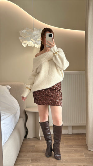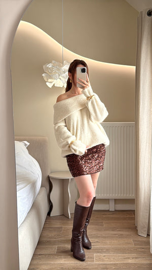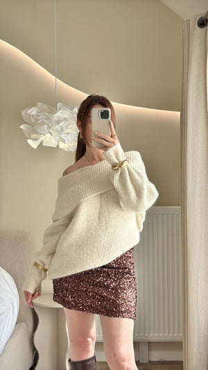 Craquez pour ce pull XXL en grosse maille, une pièce tendance qui combine chaleur et style. Son col Bardot met subtilement en valeur les épaules pour une allure à la fois décontractée et séduisante.