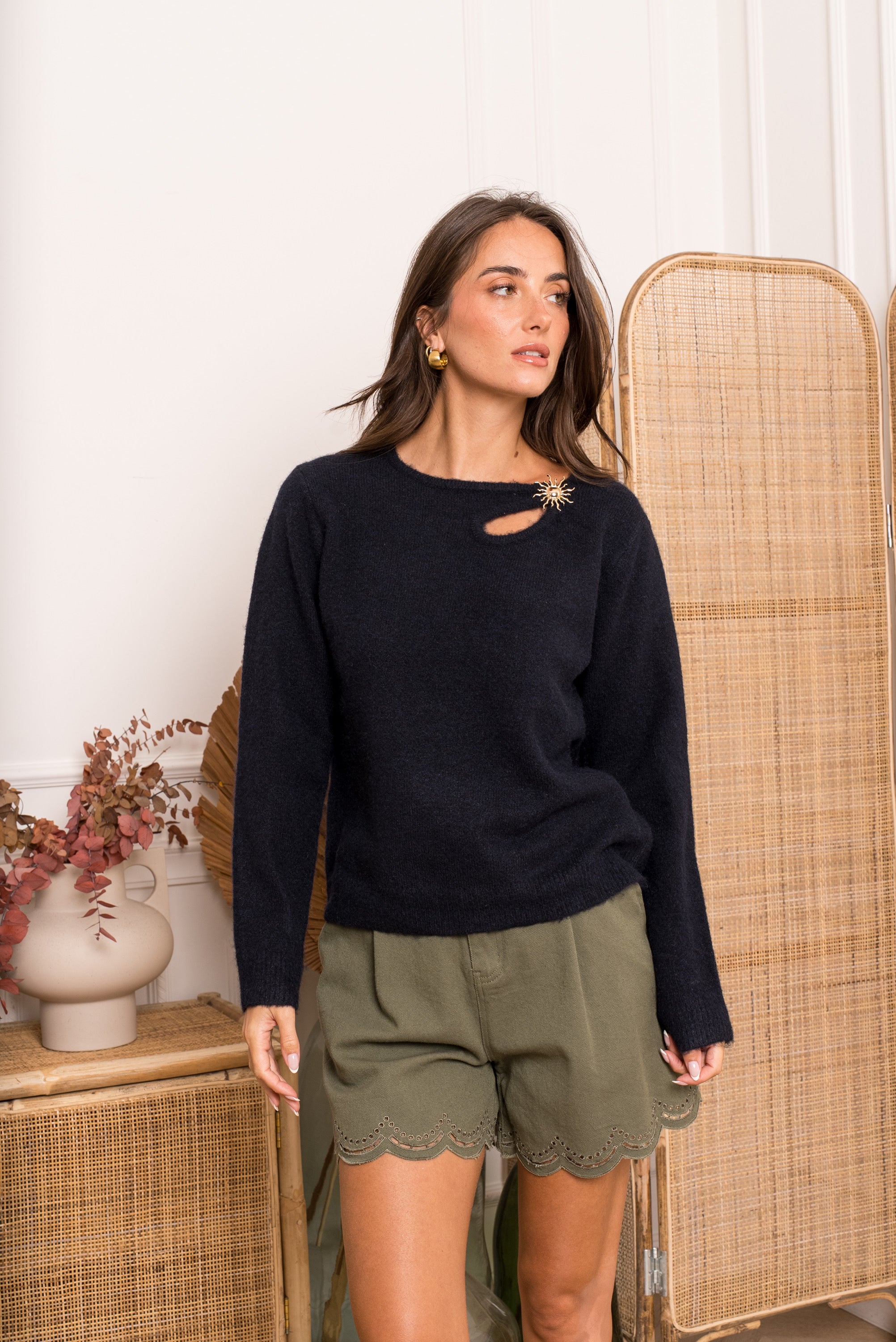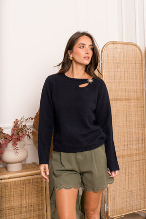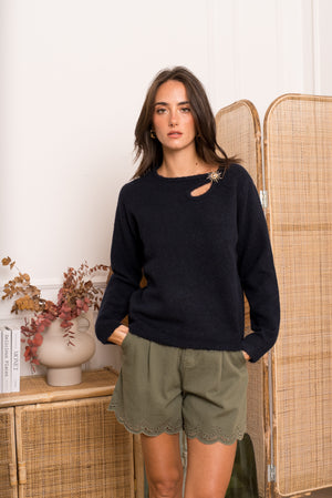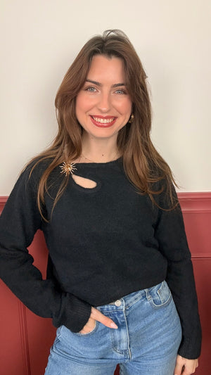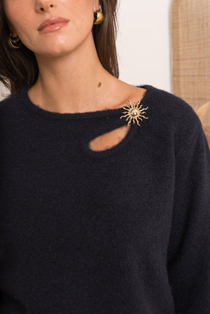 Affirmez votre style avec ce pull noir à la fois élégant et audacieux. Conçu dans une maille douce et confortable, il se distingue par sa découpe asymétrique originale au niveau de la clavicule, ornée d´un superbe boutil en forme de soleil doré. C'est la pièce parfaite pour apporter une touche de lumière à vos tenues d'hiver ou de mi-saison.