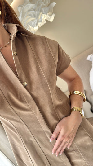 Craquez pour cette robe en daim taupe, chic et confortable, pensée pour sublimer vos looks du quotidien comme vos sorties élégantes.