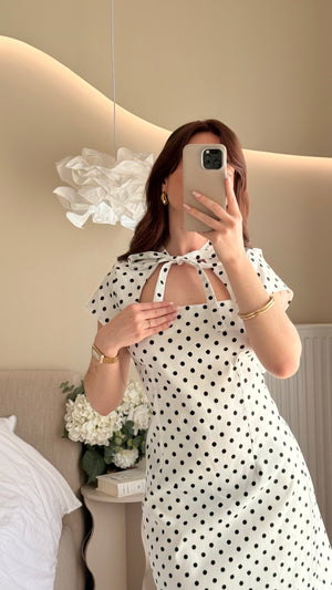 Craquez pour cette robe courte à pois au charme intemporel. Avec son imprimé iconique et son col délicatement noué, elle apporte une touche rétro ultra féminine à votre dressing. Sa coupe légèrement évasée sublime la silhouette tout en restant confortable, parfaite du matin au soir.