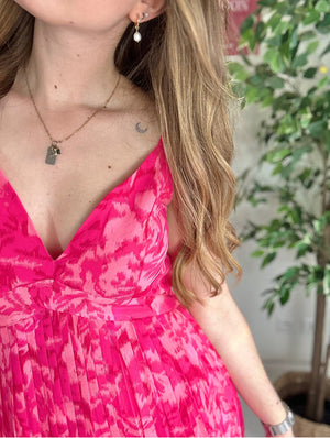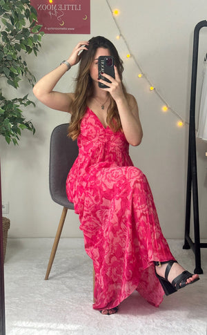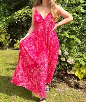 Cette robe longue plissée rose à imprimé floral est un véritable chef-d'œuvre de la mode.