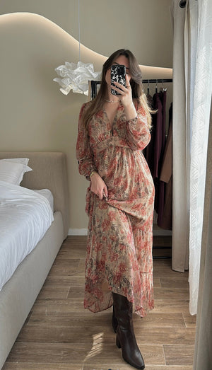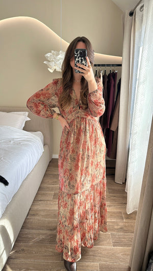 Laissez-vous séduire par cette robe longue, élégante et glamour, idéale pour les occasions spéciales. Avec ses motifs brillants subtilement dispersés, cette robe capte la lumière et offre une allure raffinée. Sa coupe fluide et ses manches longues ajoutent une touche de sophistication, tandis que la doublure interne assure confort et opacité. Le col en V apporte une note féminine et met en valeur le décolleté, parfait pour une silhouette élancée et élégante.