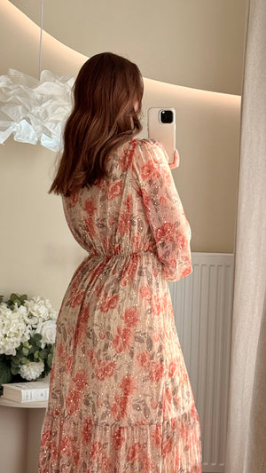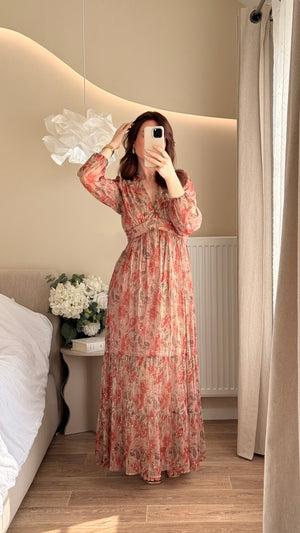 Laissez-vous séduire par cette robe longue, élégante et glamour, idéale pour les occasions spéciales. Avec ses motifs brillants subtilement dispersés, cette robe capte la lumière et offre une allure raffinée. Sa coupe fluide et ses manches longues ajoutent une touche de sophistication, tandis que la doublure interne assure confort et opacité. Le col en V apporte une note féminine et met en valeur le décolleté, parfait pour une silhouette élancée et élégante.