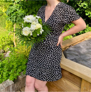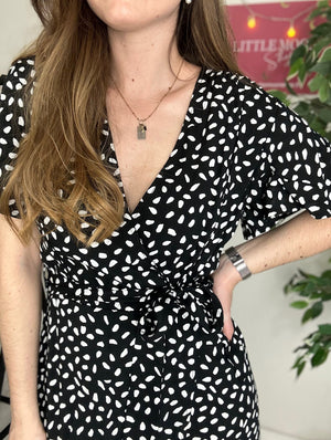 Cette robe noire à pois blanc est un choix élégant et intemporel pour de nombreuses occasions.