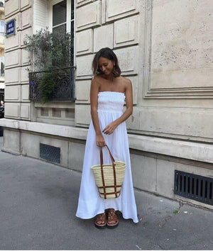 Craquez pour cette robe longue en coton à la fois fluide et confortable, idéale pour les journées ensoleillées. Son bustier élastique épouse parfaitement la silhouette tout en offrant un maintien agréable. Léger et naturel, le coton en fait une pièce indispensable pour un look bohème et estival.