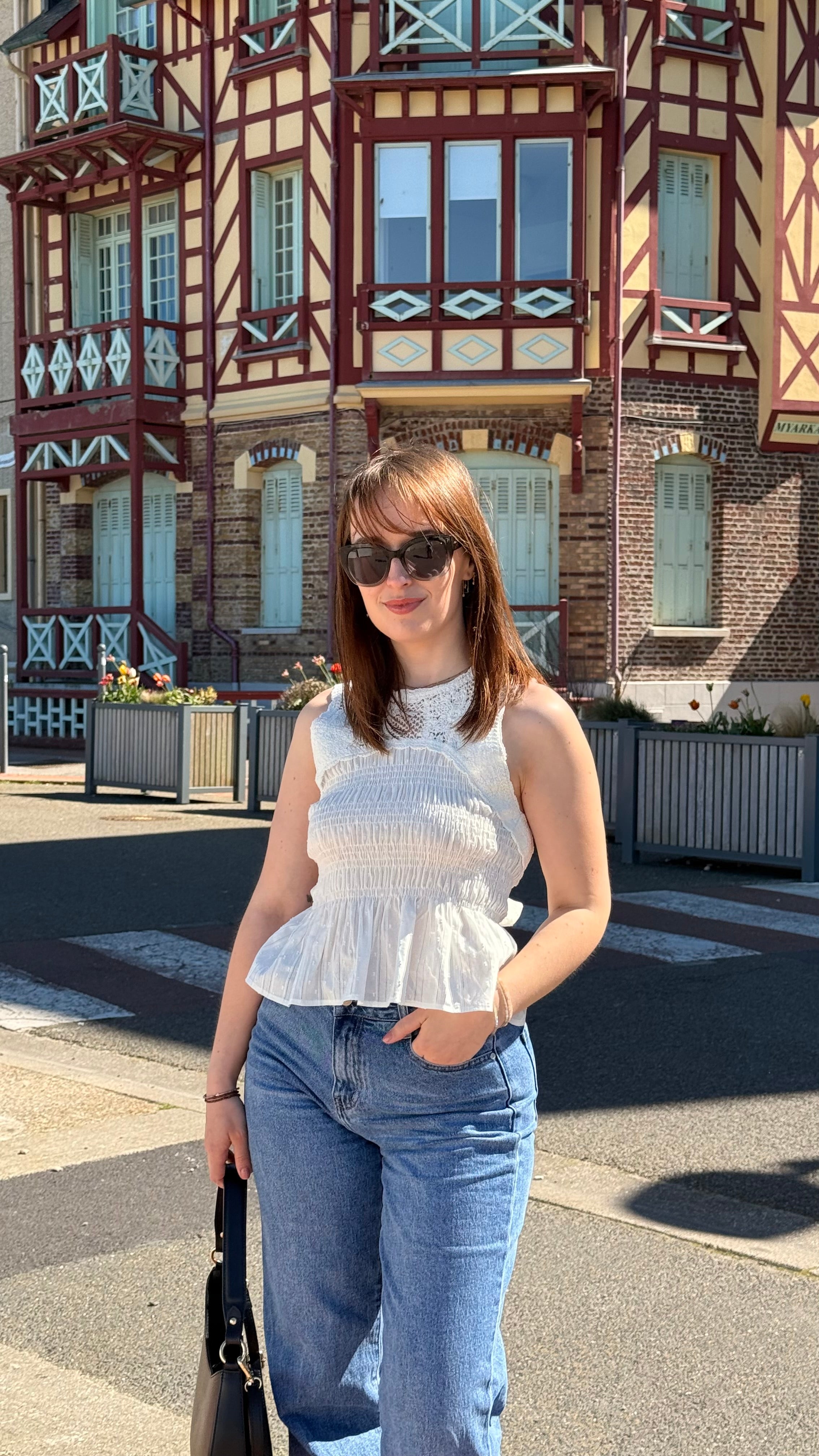 • Look de Rue Chic : Comme sur la photo, associez-le à un jean large ou droit à taille haute et une paire de mules pour un style urbain décontracté et féminin.
