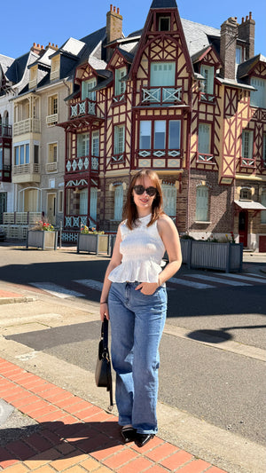 D'un blanc immaculé, ce top se distingue par son haut en dentelle délicate, son buste entièrement smocké pour une silhouette ajustée, et sa basque évasée (peplum) qui apporte fluidité et mouvement. Le véritable clou du spectacle se trouve au dos : une découpe audacieuse est subtilement fermée par un bouton perlé en haut, tandis qu'un grand nœud en tissu texturé vient magnifier la taille. Un mélange irrésistible de douceur et de sophistication, parfait pour toutes vos occasions ensoleillées.