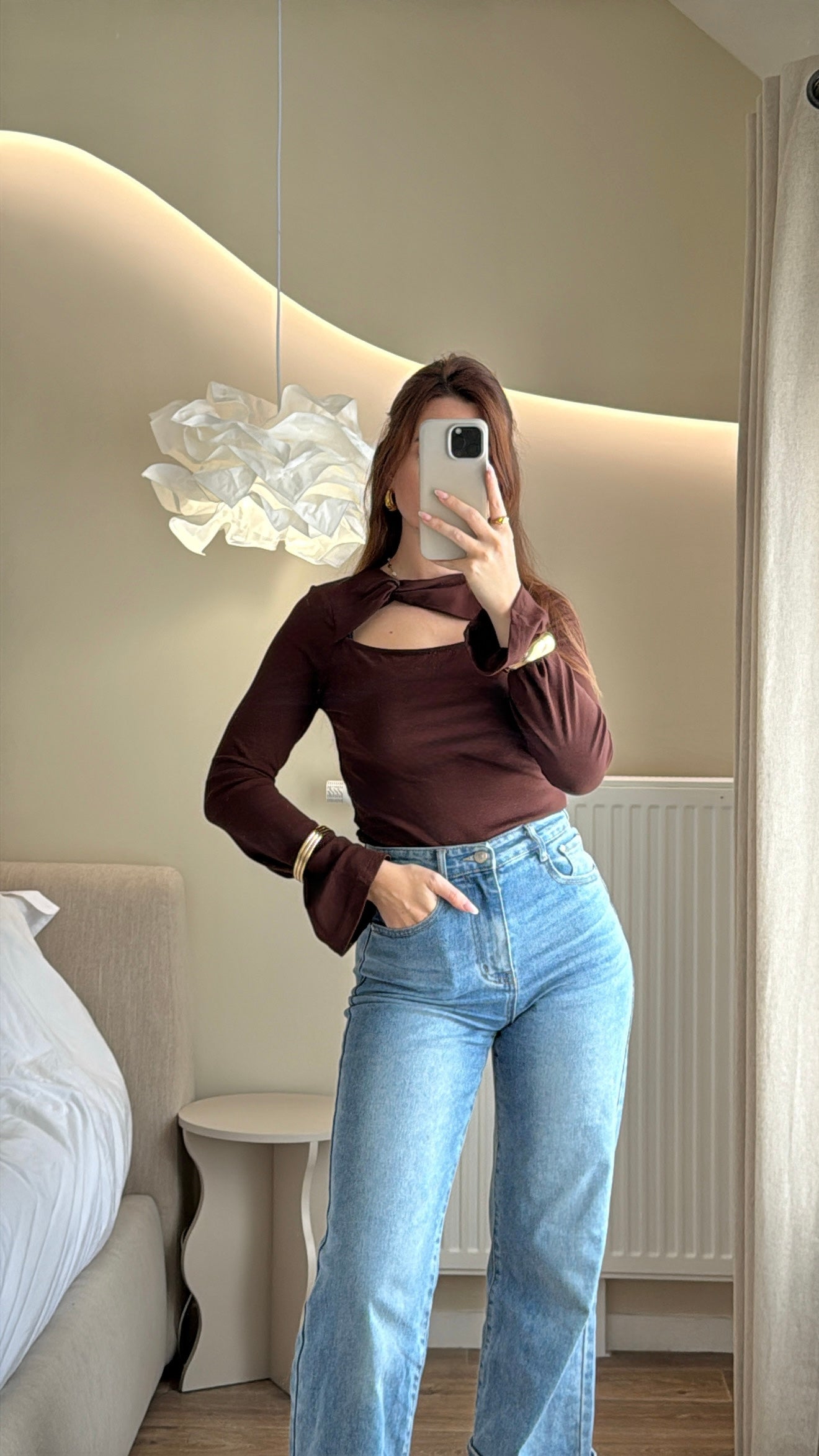 Ce top chocolat séduit par sa coupe ajustée et son détail découpé à l’avant, rehaussé d’un col noué ultra-tendance. Confortable et élégant, il allie simplicité et sophistication pour un look moderne et affirmé.