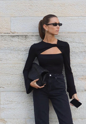 Ce top nout séduit par sa coupe ajustée et son détail découpé à l’avant, rehaussé d’un col noué ultra-tendance. Confortable et élégant, il allie simplicité et sophistication pour un look moderne et affirmé.