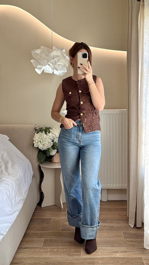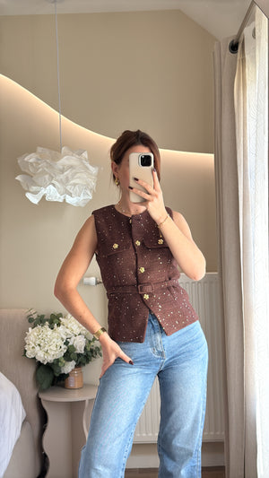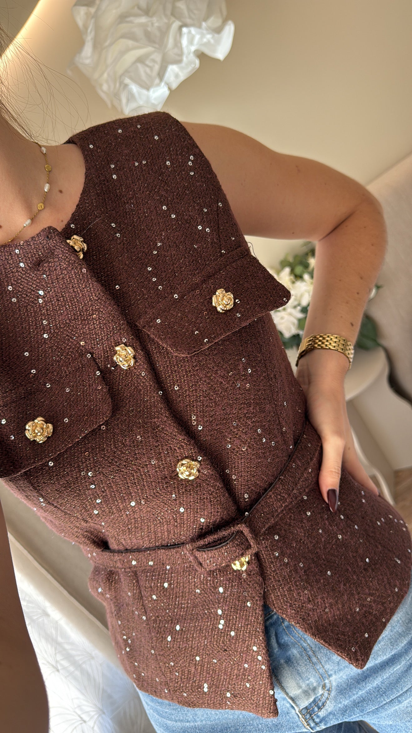 Brillez avec élégance grâce à ce top choco rehaussé de sequins scintillants. Une pièce sophistiquée et chic, idéale pour les soirées ou les occasions spéciales.