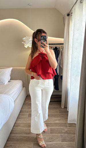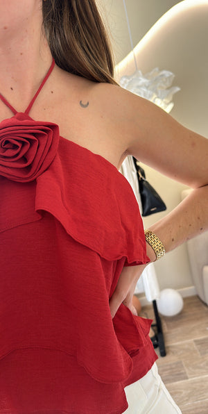 Ce top terracotta incarne l'élégance féminine avec une touche romantique et audacieuse. Conçu dans un tissu fluide et léger, il se distingue par son attache délicate au cou, qui met en valeur le décolleté, ainsi que des volants qui ajoutent du mouvement et de la texture à la tenue. Le détail central, une rose en tissu subtilement placée au centre, offre une touche unique et sophistiquée à ce top, parfait pour les occasions spéciales ou pour un look élégant au quotidien.