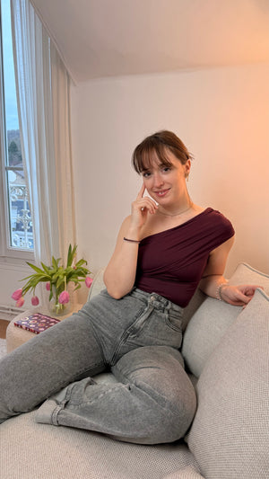 Affirmez votre style avec ce top asymétrique au design audacieux et sophistiqué. Sa coupe unique, mêlant une épaule drapée à une épaule dénudée, en fait une pièce forte et élégante, idéale pour une soirée chic ou un événement spécial.