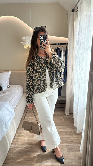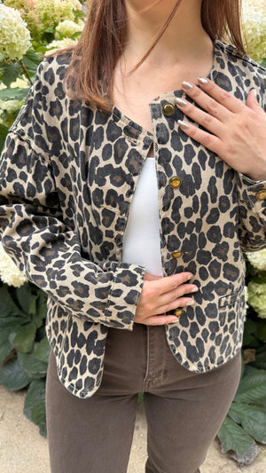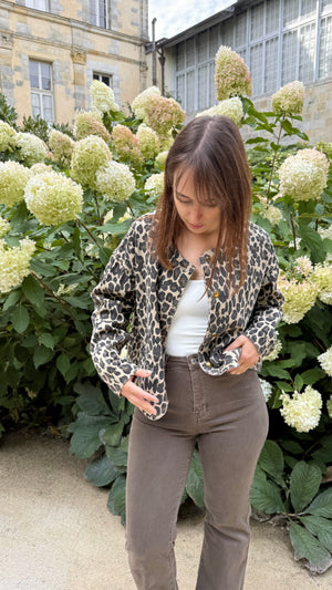 Cette veste en jean motif léopard peut être portée de multiples façons pour un look personnalisé :